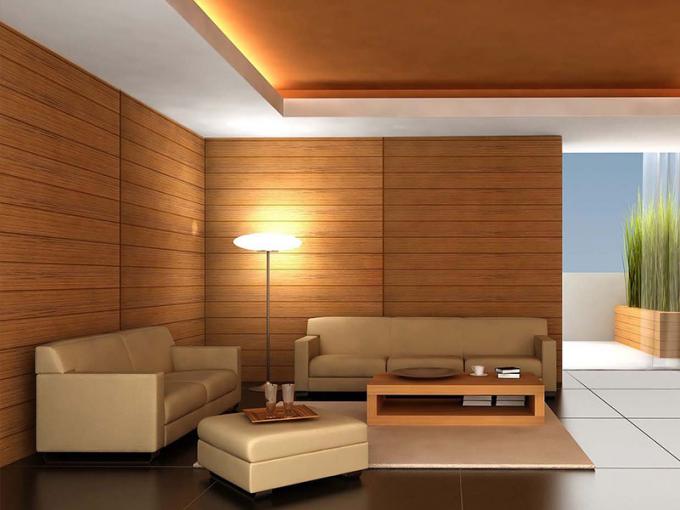 غرفة المعيشة في الصورة هو الزخرفية مع الخشب ألواح خشبية مغلفة تصميم، يبدو الخشب الحقيقي، ولكن تكلفة أرخص بكثير وأسهل لتثبيت من الخشب. بل هو أيضا من السهل لتنظيف.